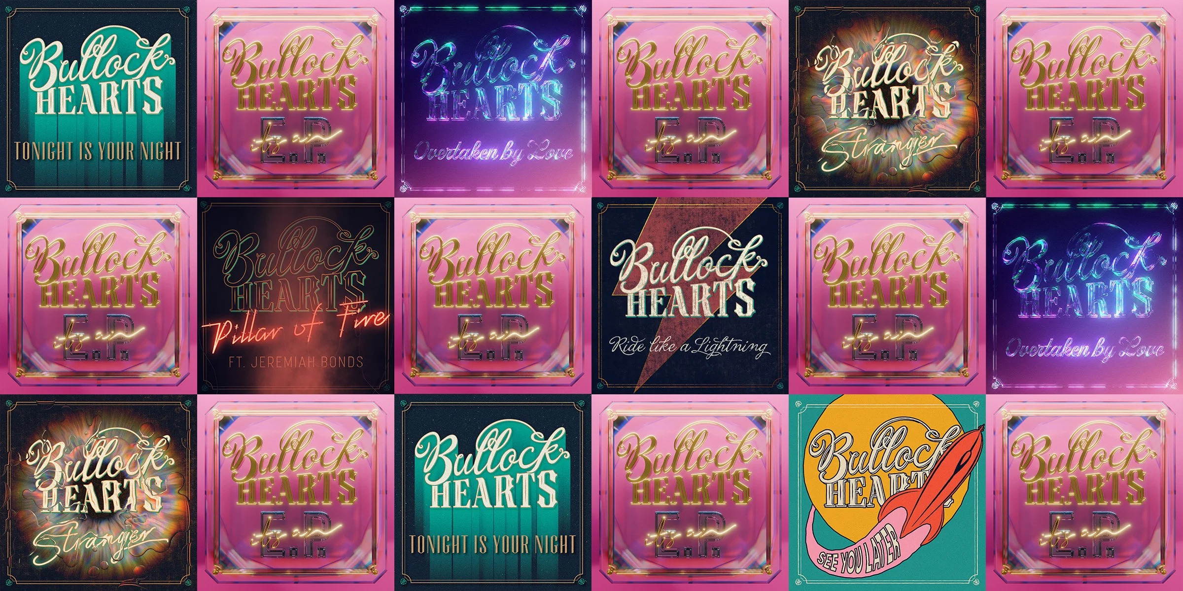 Bullock Hearts needed a brand that could evolve with their music without losing its identity. One logo, countless expressions. A system flexible enough to visualize different songs and albums conceptually while staying unmistakably them.